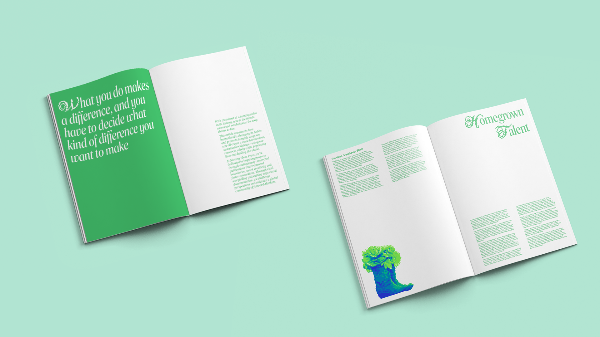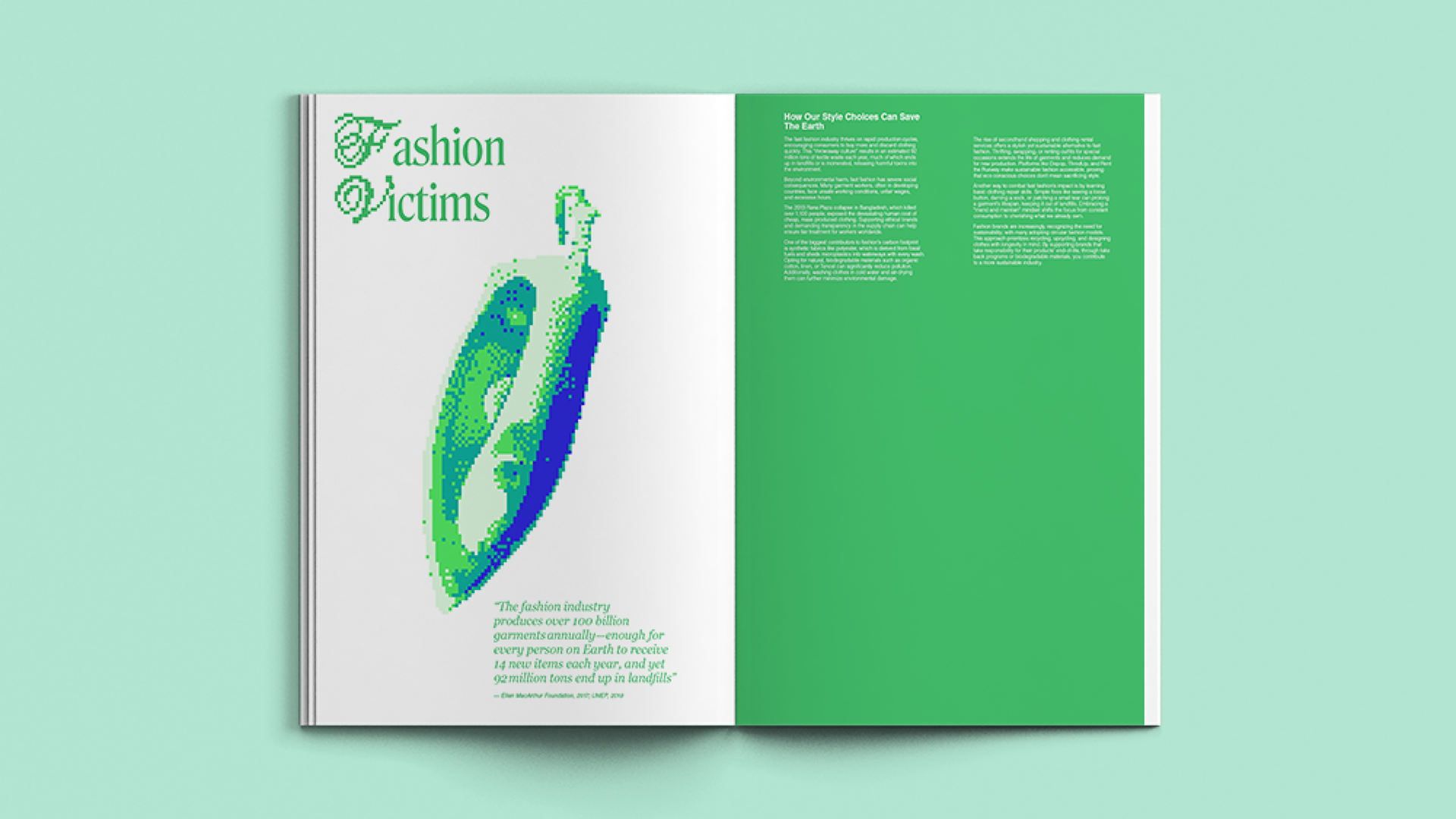 The elegant serifs are contrasted with heavily pixelated drop caps, making it a blend of two distinct styles and representing the harmony between technology and nature.