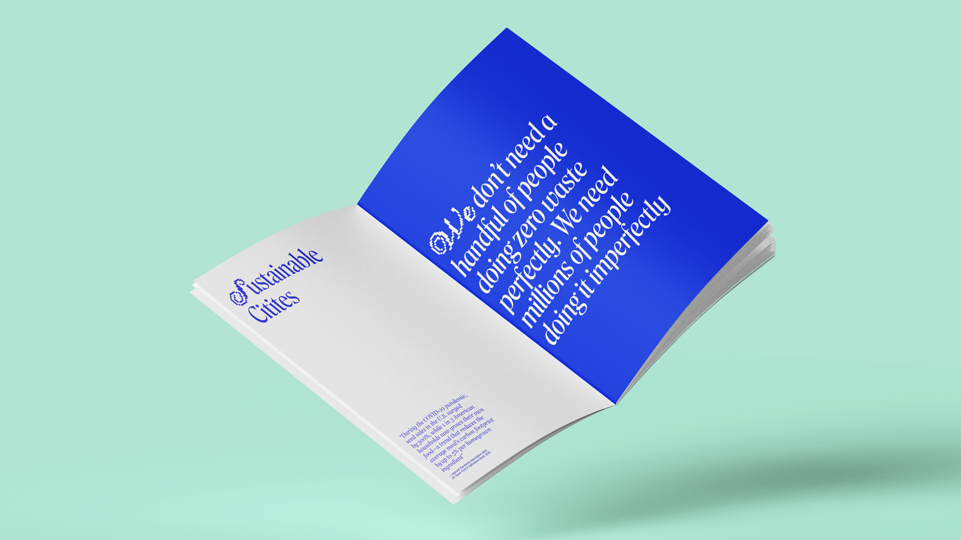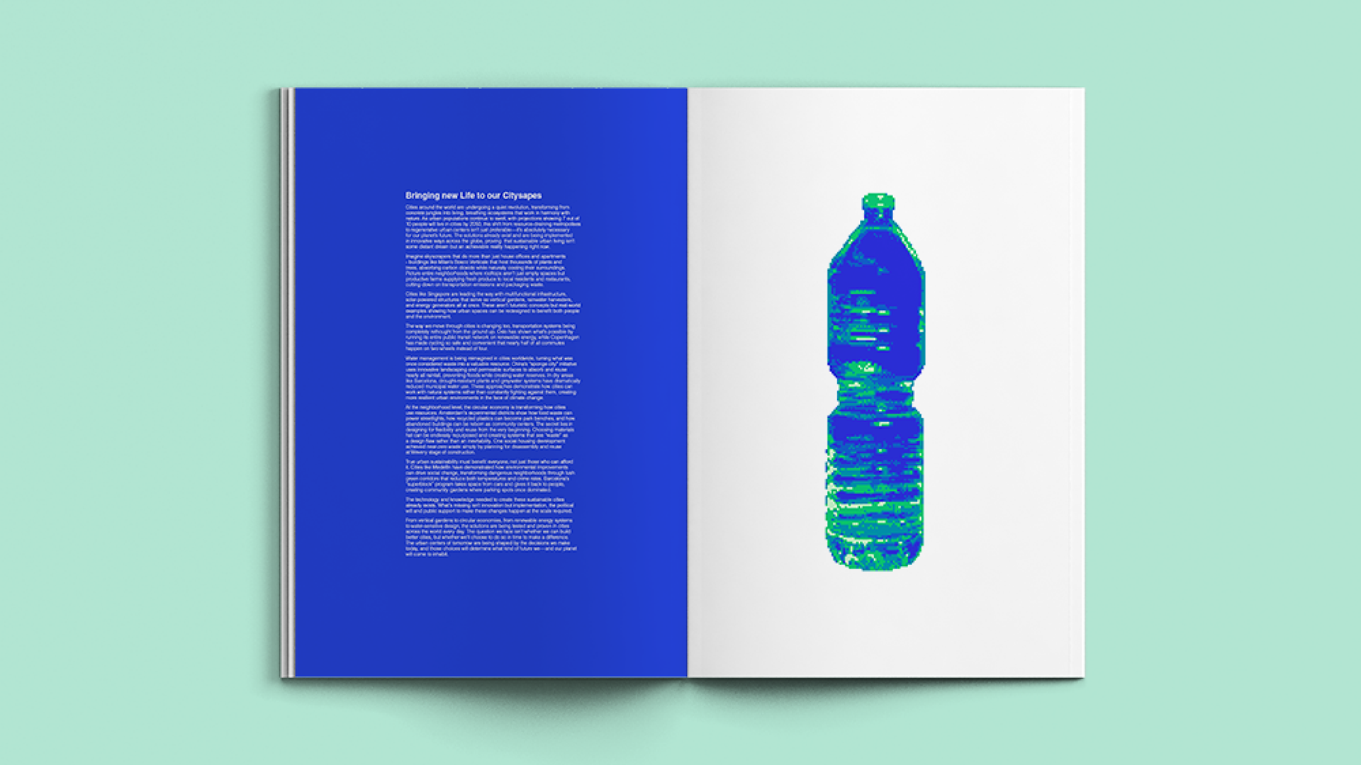 The brochures visual language is based on heavy uses of contrast. Green and blue are colors naturally associated with recyclying, but their bright tone makes them seem digital and modern.