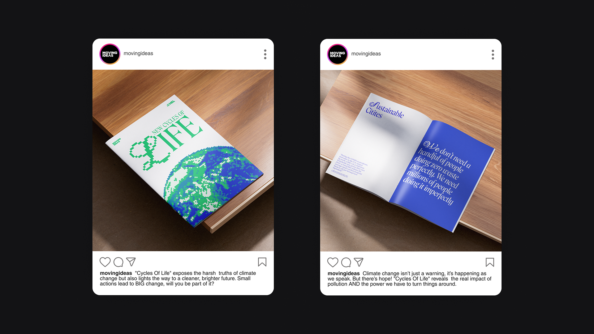 Cycles of Life is a brochure that addresses the dangers of pollution and climate change while highlighting emerging technological solutions that offer hope for a better and greener future. It targets both eco-conscious individuals and technology enthusiasts.